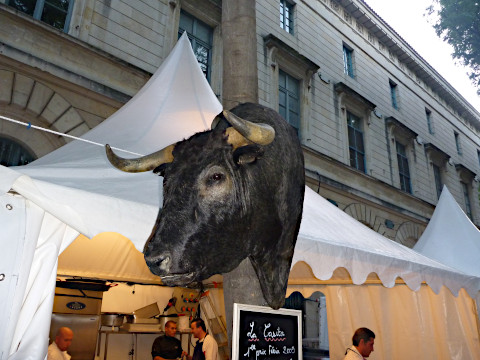 We left our packs in the bar after checking out of our room and toured the Salvador Dali museum. Another weird dude, but maybe not quite as messed up as Picasso. We spent a few hours wandering the streets and shopping for food before boarding the train for the French border. After an exhaustive 3-second inspection of our passports, we were admitted into France. We figured out the French train system, rode to Perpignan, and made an immediate connection to the train for Nimes, where we spent the night near the station. During our evening stroll, we found that we happened to hit town at the start of some big 5-day bull fight festival. A lot of the streets were blocked off with food and drink booths everywhere and tons of people milling about. We wondered if we might have to dodge charging bulls in the streets, but fortunately did not. The local arena was started in 14 BC and was pretty much in its current configuration by the 6th century. As we were walking by, the day’s event apparently ended, as a crowd came pouring out of it. We strolled in and took some pictures inside. Joe climbed to the top via a bunch of dark passages and stairs for a bird's eye view – a very impressive place.