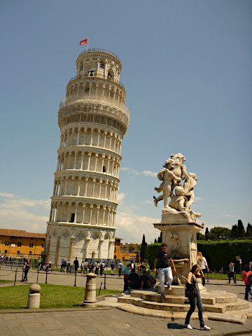 Breakfast came with the room and was nicer than that to which we've become accustomed. Fresh juice, coffee or tea, cereal, and a wide variety of yummy pastries. Guess what we had? And when we started to leave, they handed us two sack lunches with fruit, sandwich, a little block of cheese, a big bottle of water, and a juice box. "Local tradition," the man said. We missed our train by about forty-five seconds, so we did another Italian lesson on the MP3 player while we waited for the next one. We stopped in Pisa to change trains, and hiked into town to see the tower. It was better than we'd anticipated, but very commercialized, as one would expect. We went back to the station and rode to our semi-random town of the day, Cecina. When we got off the train, we found a fairly large town nearly completely shut down for Sunday. Naturally, we went the wrong direction for about ¼ mile before turning around and hiking seemingly forever to the closed-on-Sunday info center. It was hot and muggy and had rained lightly on us several times, so we inquired at the first hotel we found. We were pleasantly surprised to get a very nice large room with a view of the Mediterranean for 60 Euros, but declined breakfast, so no sack lunches for us tomorrow. Shortly after we checked in, a genuine thunderstorm rolled through the area. We showered and napped, then after supper went for a sunset stroll along the beach. This is more like it: no teeming crowds, no beggars, no hustlers.