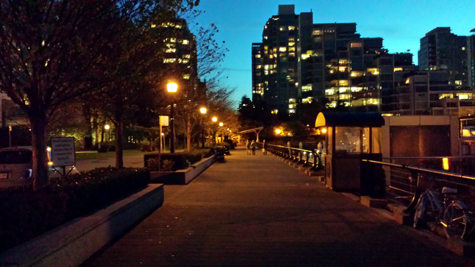 The redevelopment of the waterfront also confused us in regards to the newspaper scene in 'The Valkyrie'. It was filmed just east of the 'Dramatic License' location, but we originally thought it was at [49.290567,-123.125911]. As I was making the screenshots I realized it had to be much closer to where the Amanda-and-Carolyn scene was filmed around the Westin hotel, which I confirmed after discovering that there used to be a restaurant (Trader Vic's) just east of the hotel, where Cardero Park is now. Unfortunately, I didn't figure this out until *after* the 2015 trip, so I while I got a photo looking *toward* the right location, it wasn't quite far enough down the seawalk. These are photos of the wrong location at [49.290567,-123.125911] from my first trip to Vancouver.