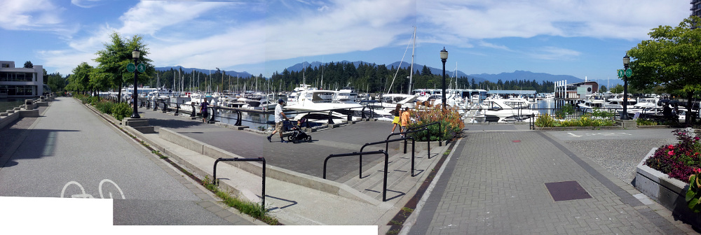 On my first visit, I couldn't figure out the route Amanda & Carolyn traveled and ended up guessing wrong. Part of my confusion stemmed from the fact that the waterfront was redone sometime after the series was filmed, and there is now a restaurant at the corner they walk past, which was added in 2004. These photos are at [49.293117,-123.131310], west of where they actually were.